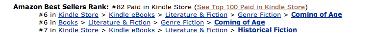 Reaching #82 in the entire Kindle Store was very cool. If you’ve looked at some of the other books I’ve managed, they’ve ranked higher in individual categories, but not as high in overall ranking. That’s because Revontuli is in very competitive categories! Coming of Age and Historical Fiction are very popular genres, whereas something like Nonfiction > Masonry is less so.